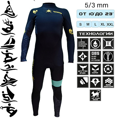Особенностью костюма является агрессивный дизайн и увеличенные зоны из материала NanoCatPLUS – подкладка из флиса на груди и спине. Толщины неопрена в 5/3 мм хватит даже для прохладных дней. Использована также подкладка ThermoPowerPLUS (NanoCatPLUS), гарантирующая тепло и комфорт.