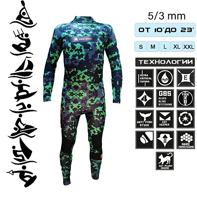 Особенностью костюма является агрессивный дизайн с увеличенными зонами из материала NanoCatPLUS – подкладка из флиса на груди и спине. Толщина 5/3 мм и технология ThermoPowerPLUS (NanoCatPLUS) обеспечивают тепло и комфорт даже в прохладные дни.